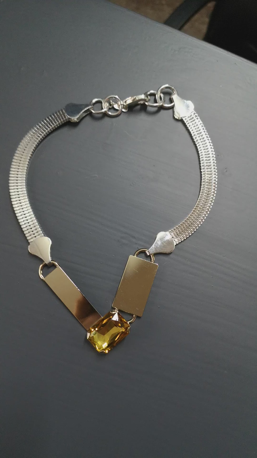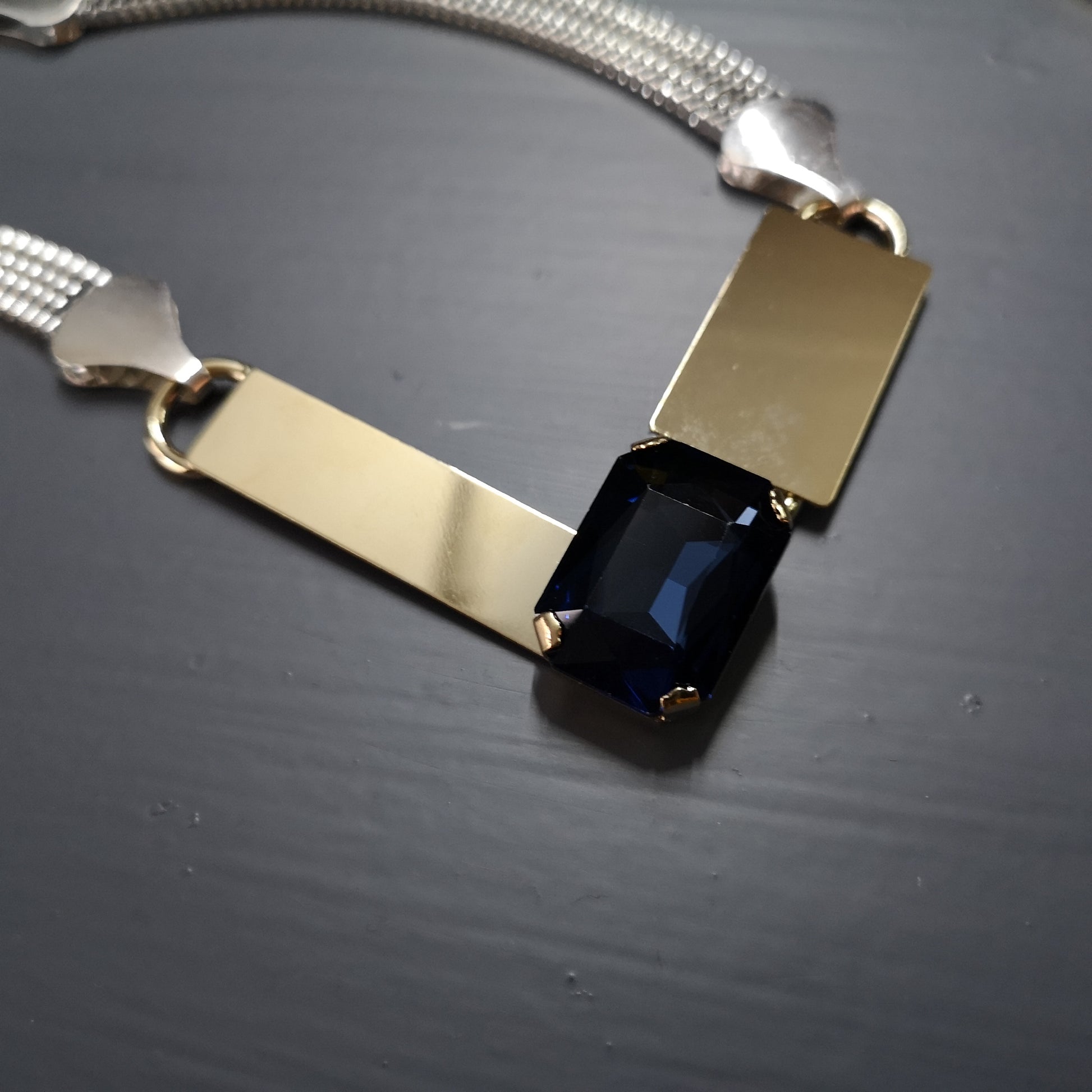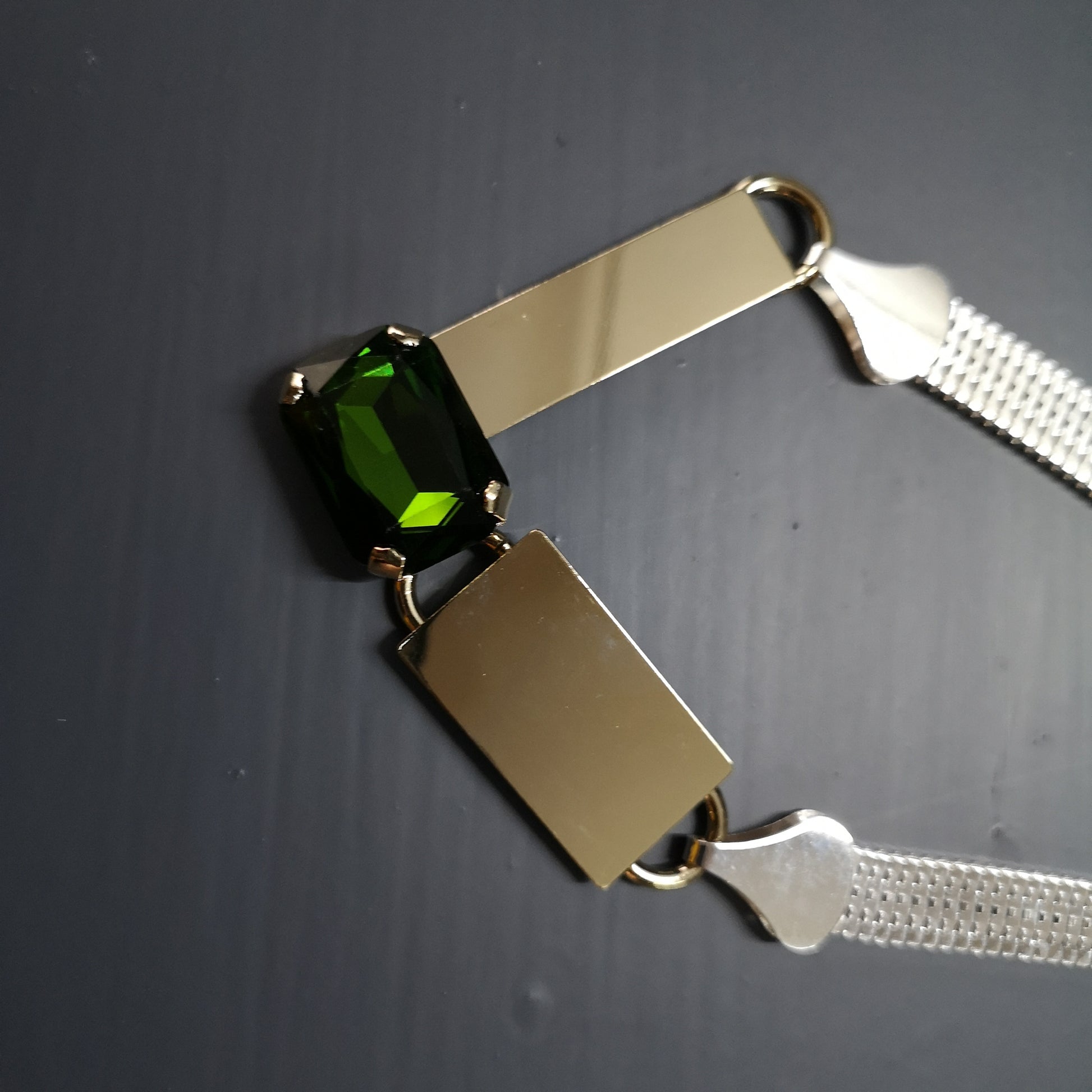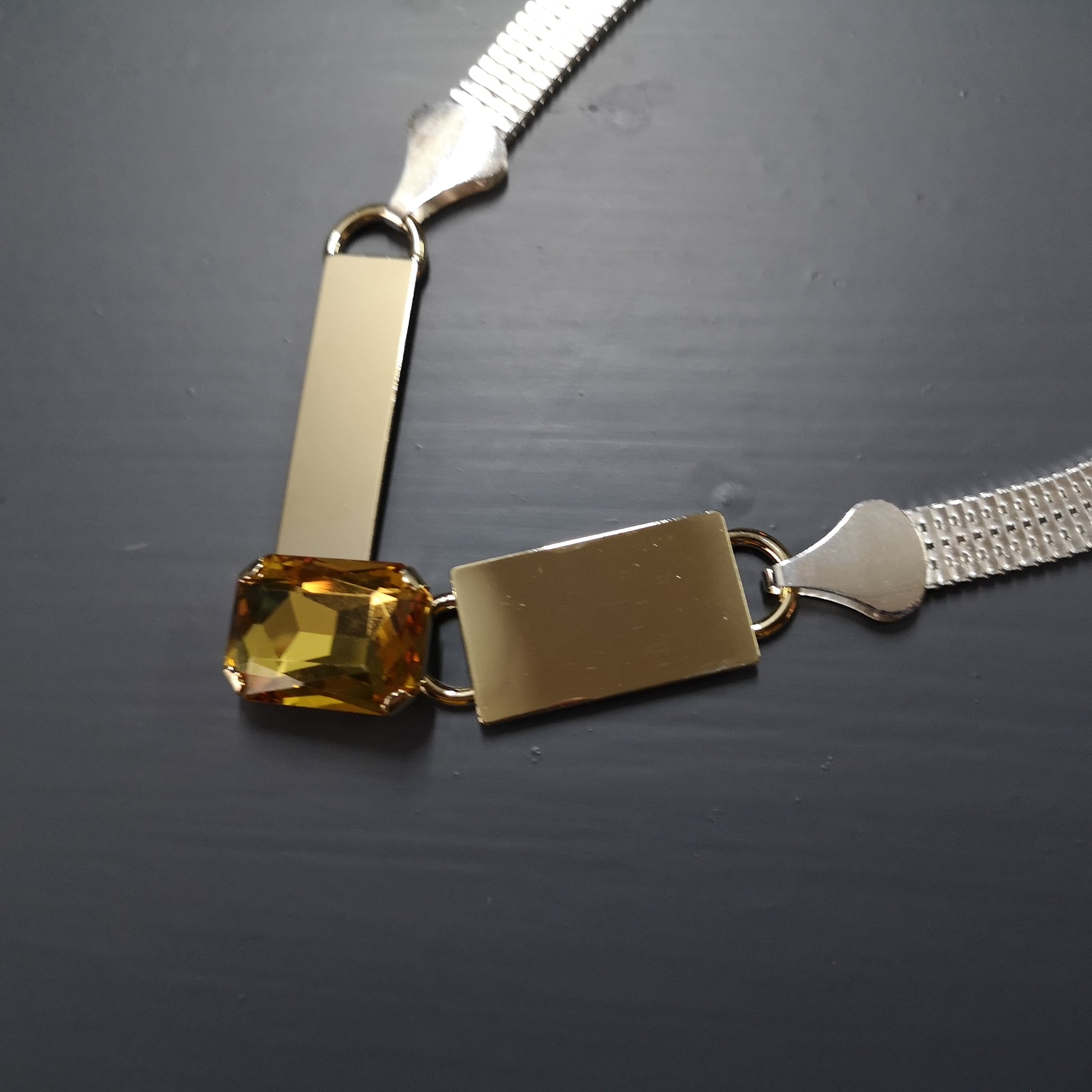 The futuristic necklace with a medieval touch. Colored crystal on yellow bronzeplated base with silverplated lightweight tank chain. The yellow bronze plating looks like gold, but ages more like bronze when you wear it for a long time. The silverplated parts can oxidize as silver does, giving a nice patina with time. Total length 45 cm, which is a medium size. Crystal is 24*17 mm.