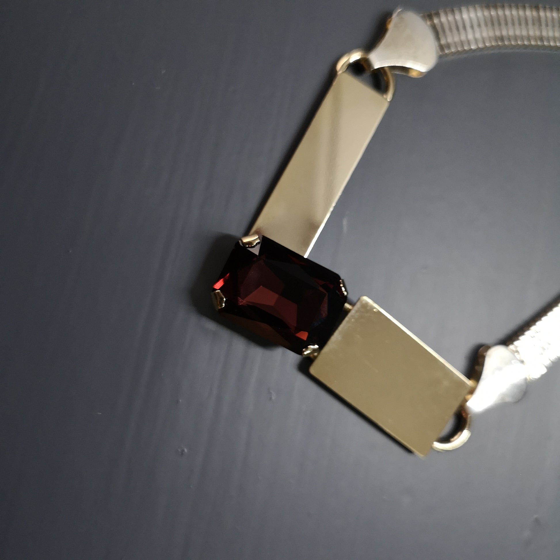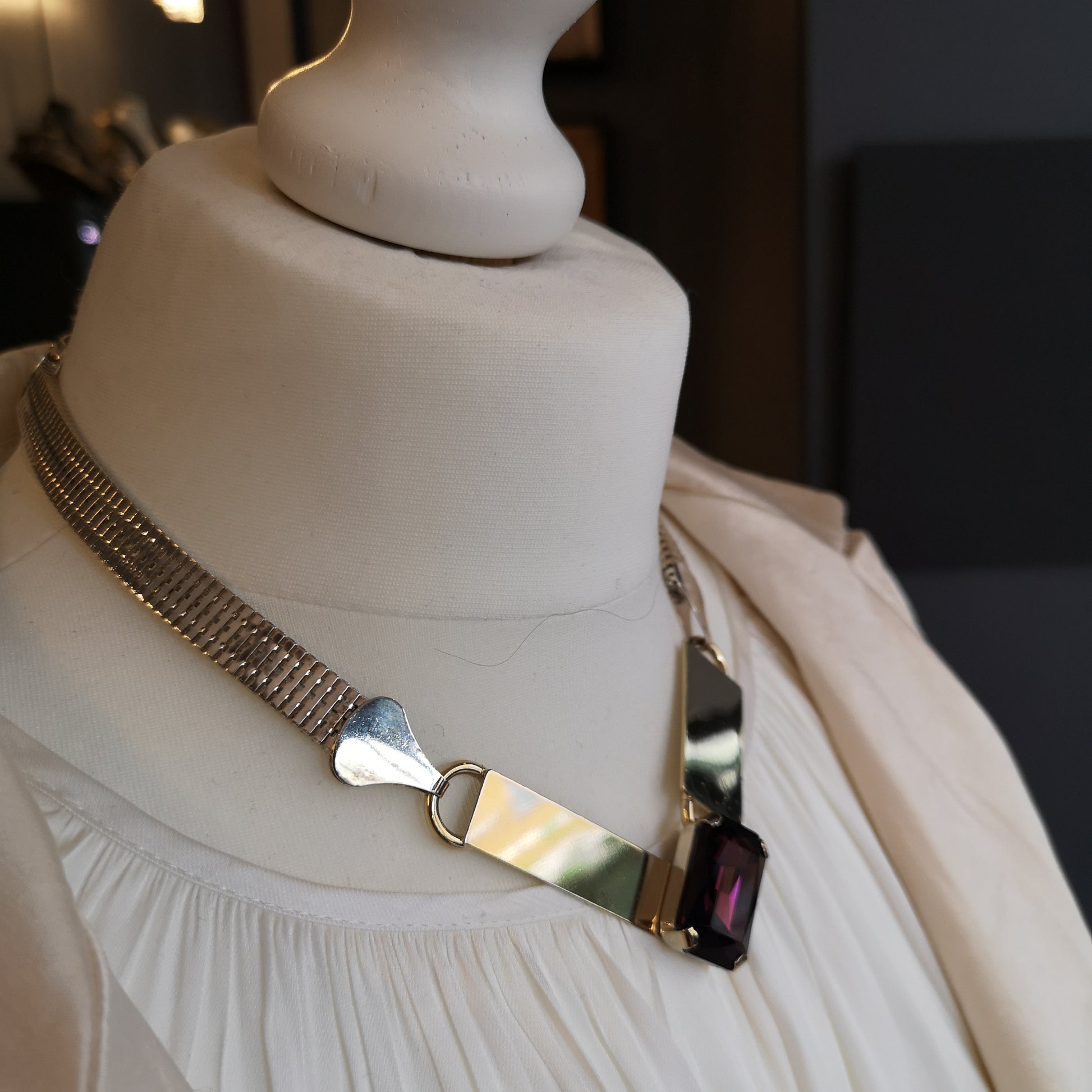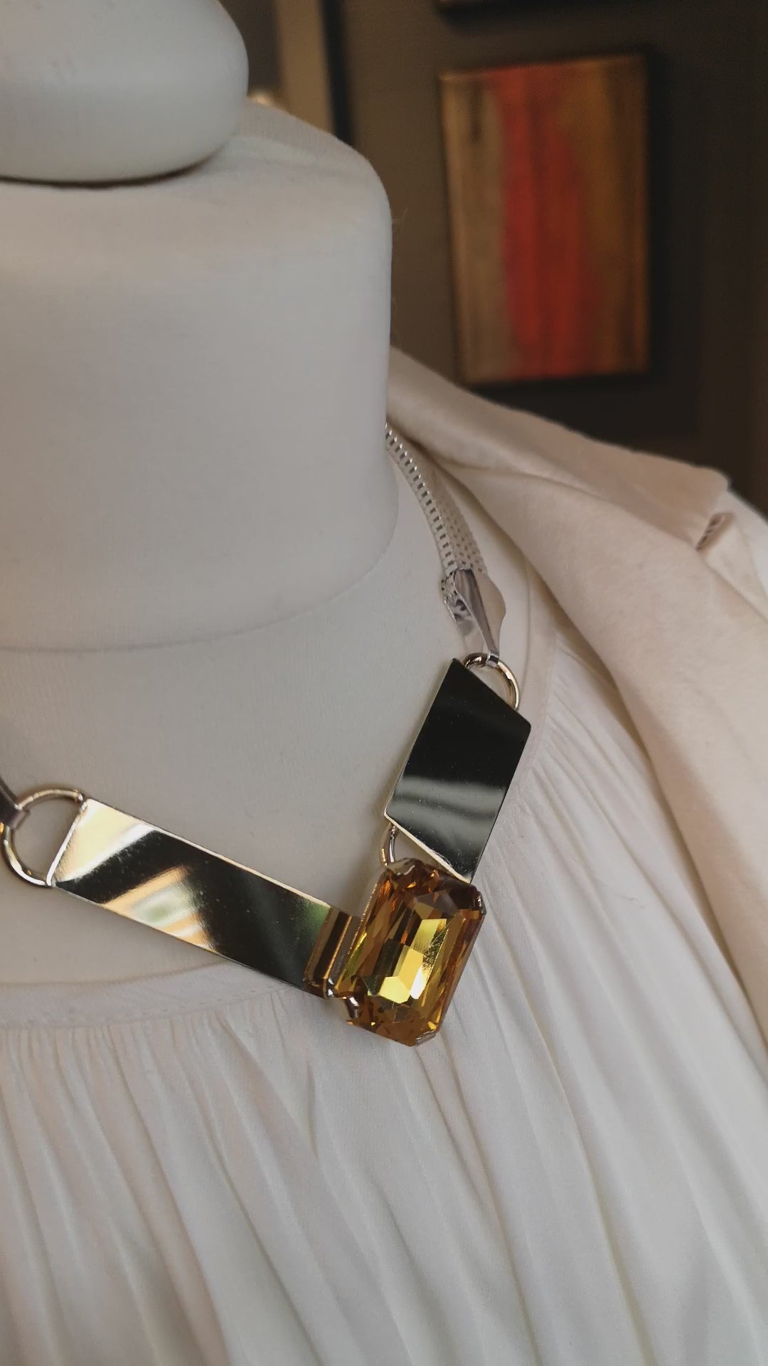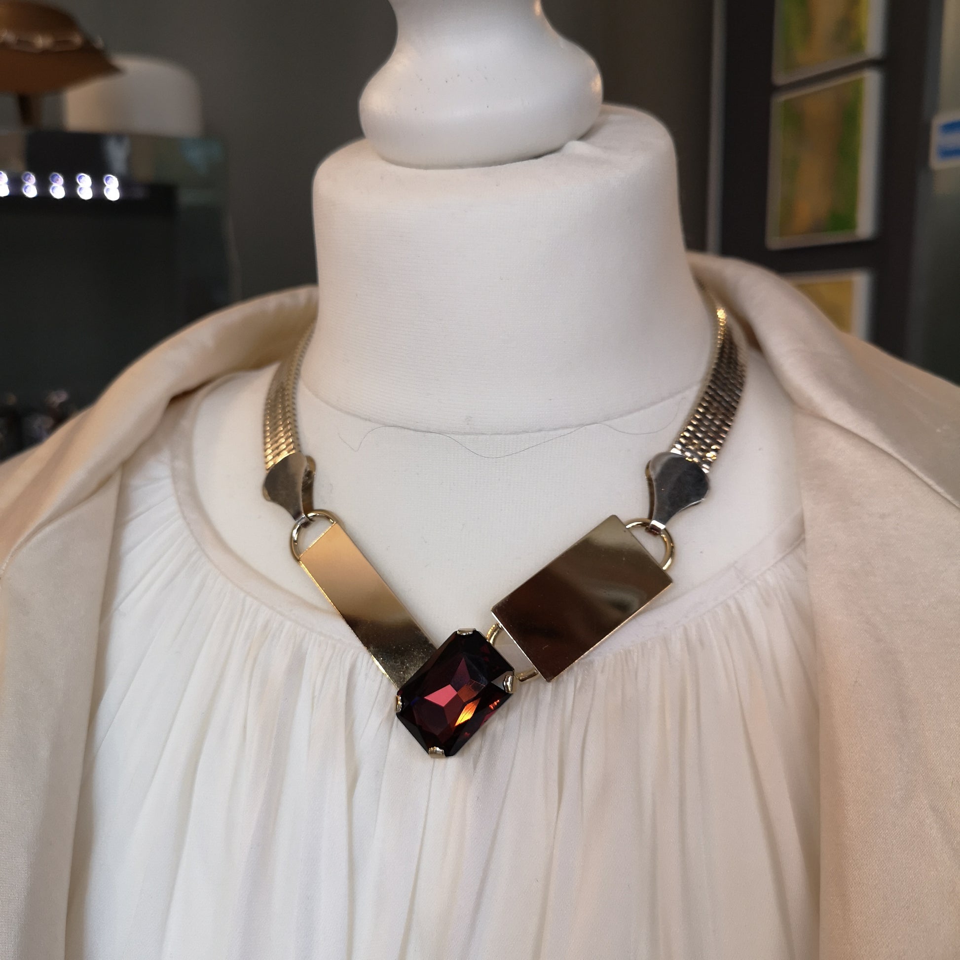 The futuristic necklace with a medieval touch. Colored crystal on yellow bronzeplated base with silverplated lightweight tank chain. The yellow bronze plating looks like gold, but ages more like bronze when you wear it for a long time. The silverplated parts can oxidize as silver does, giving a nice patina with time. Total length 45 cm, which is a medium size. Crystal is 24*17 mm.