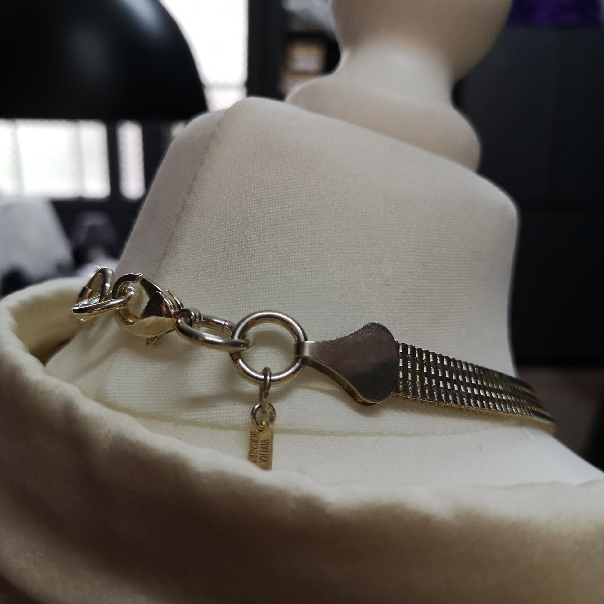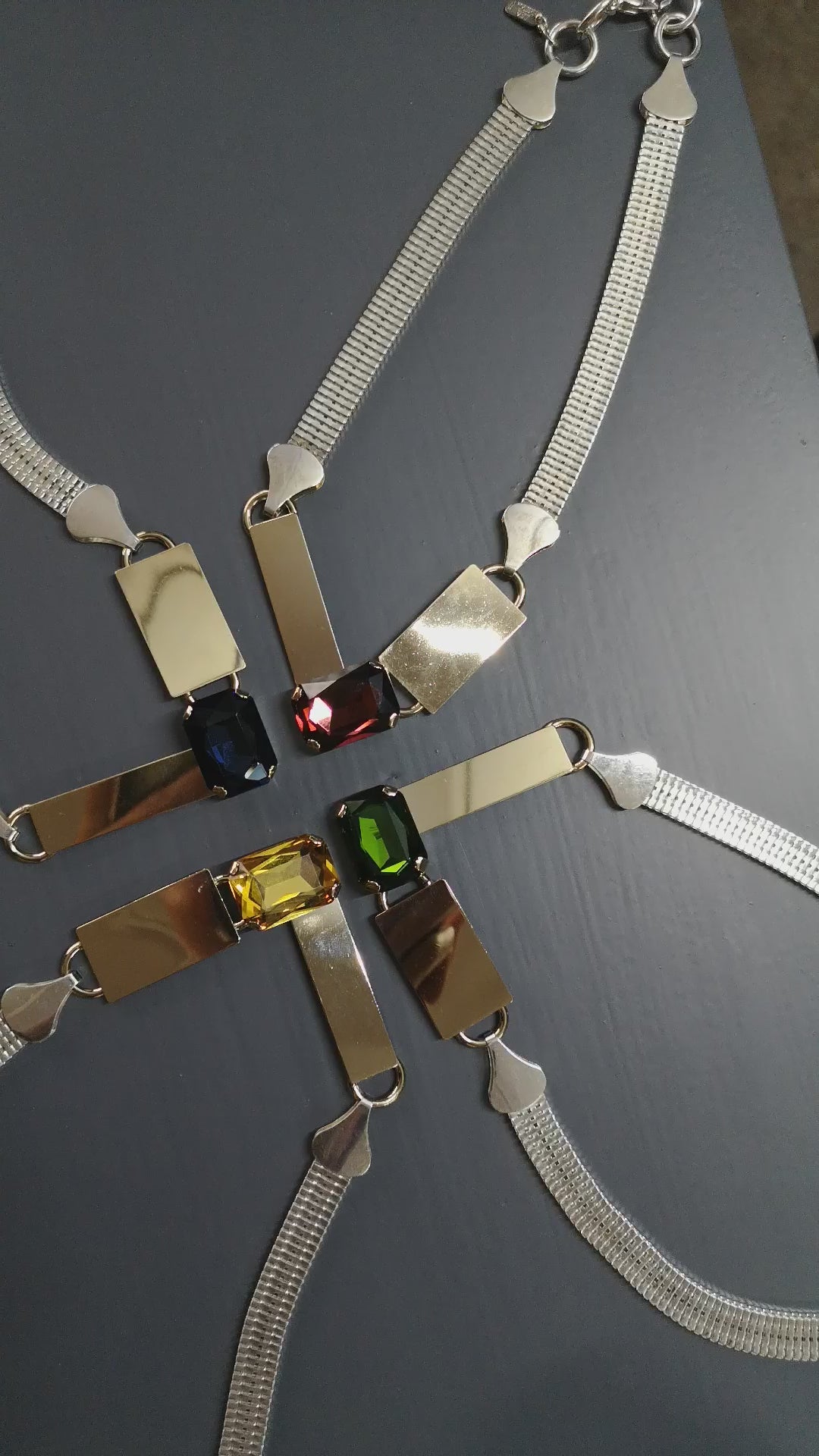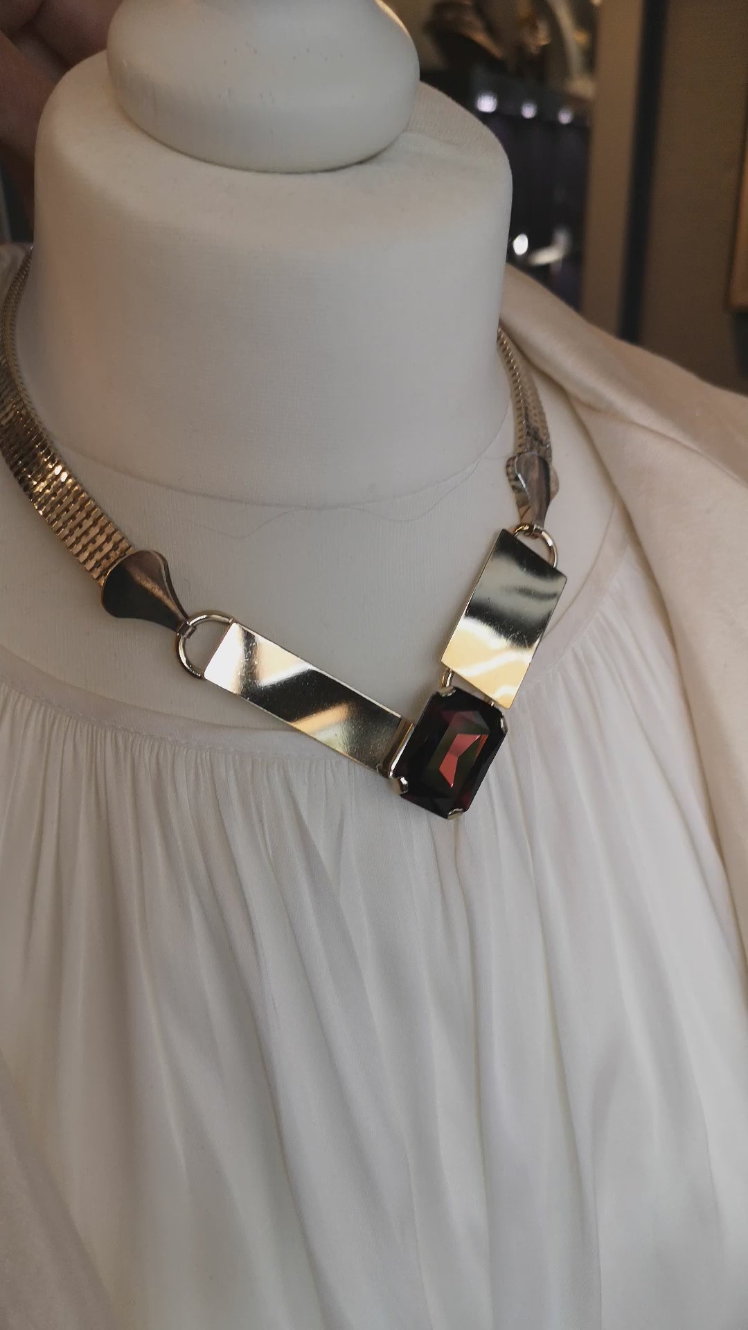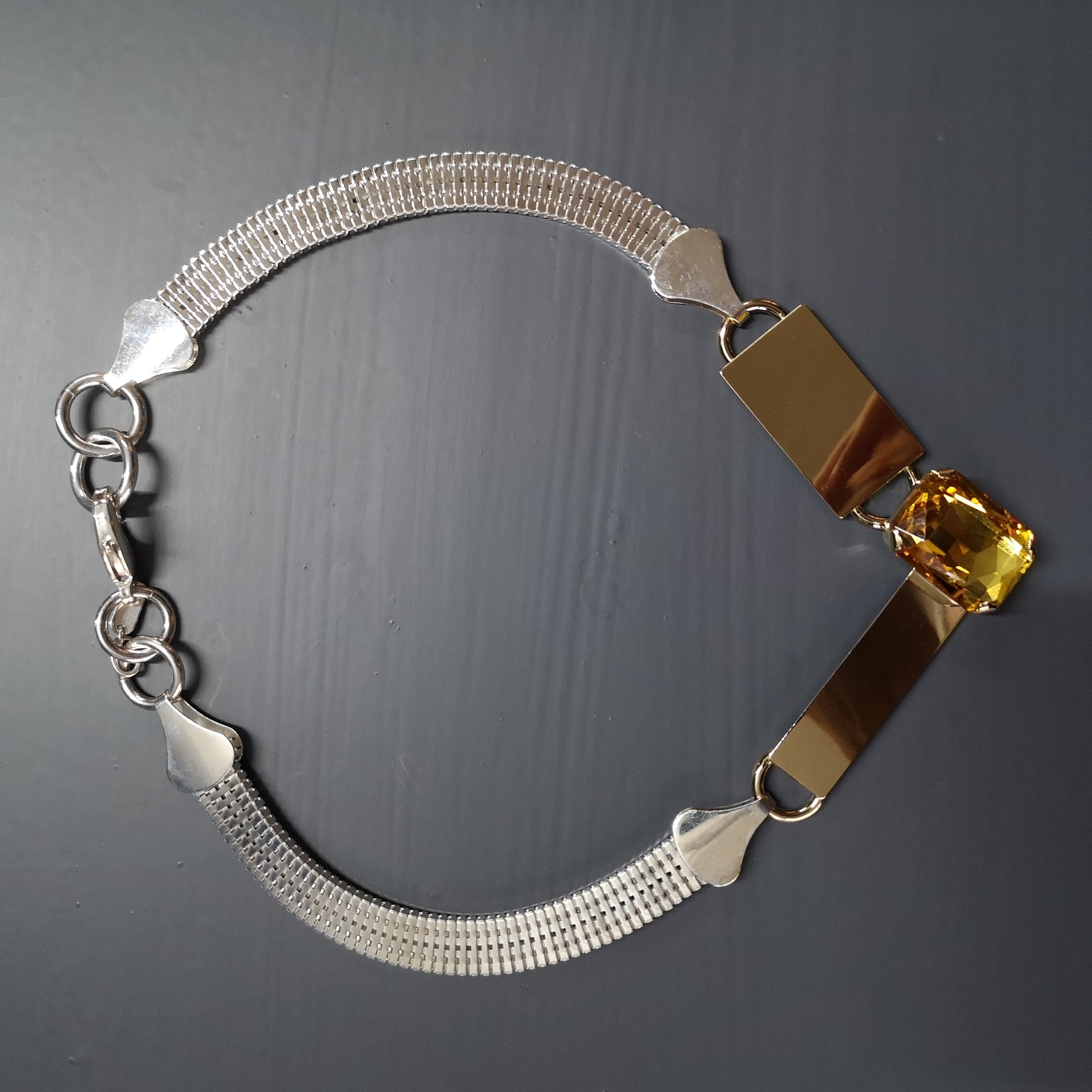 The futuristic necklace with a medieval touch. Colored crystal on yellow bronzeplated base with silverplated lightweight tank chain. The yellow bronze plating looks like gold, but ages more like bronze when you wear it for a long time. The silverplated parts can oxidize as silver does, giving a nice patina with time. Total length 45 cm, which is a medium size. Crystal is 24*17 mm.