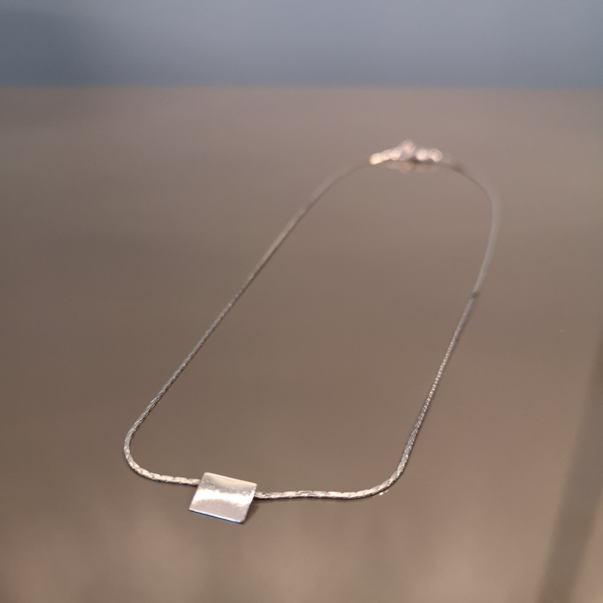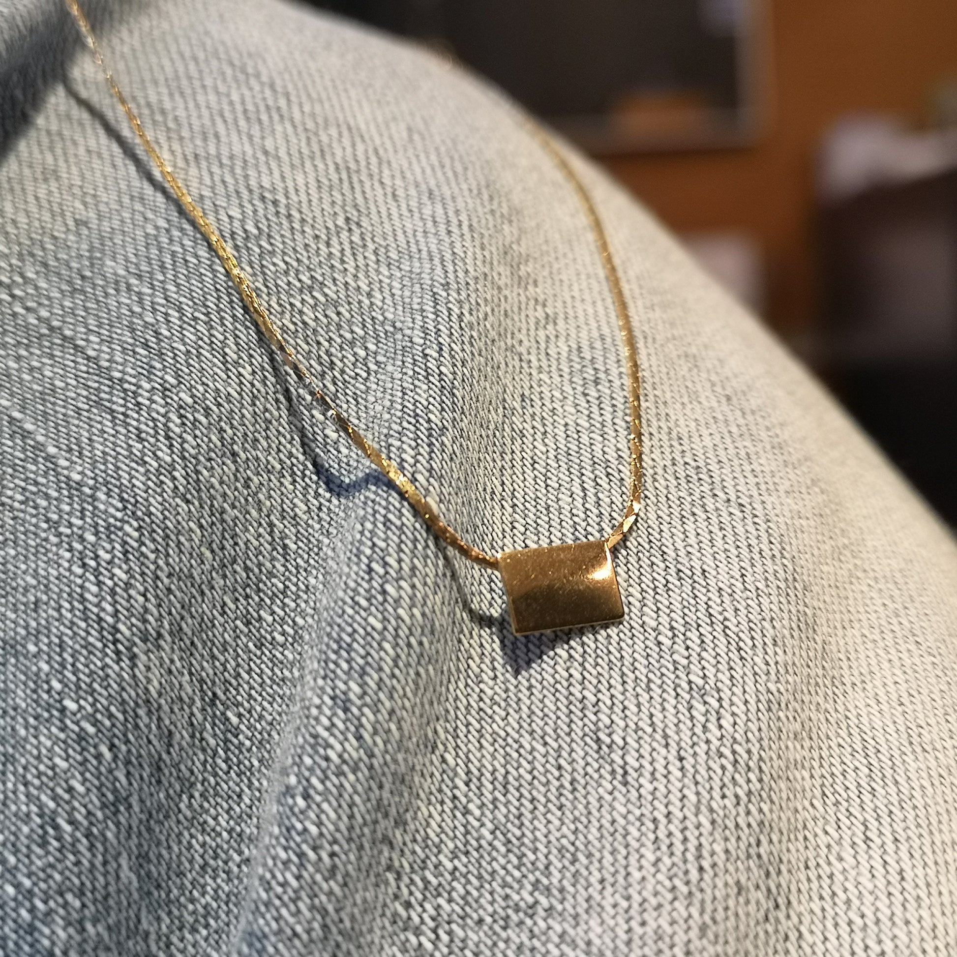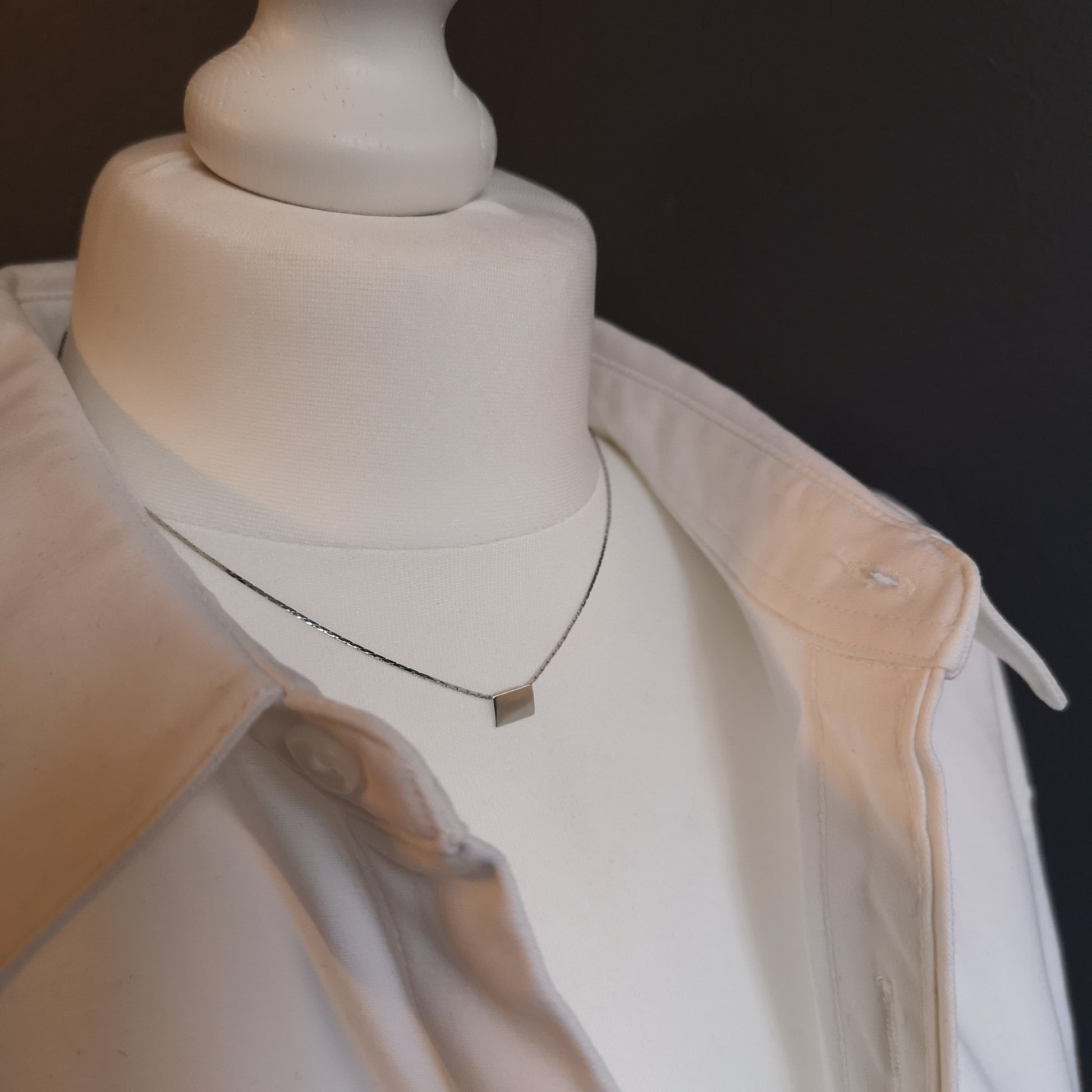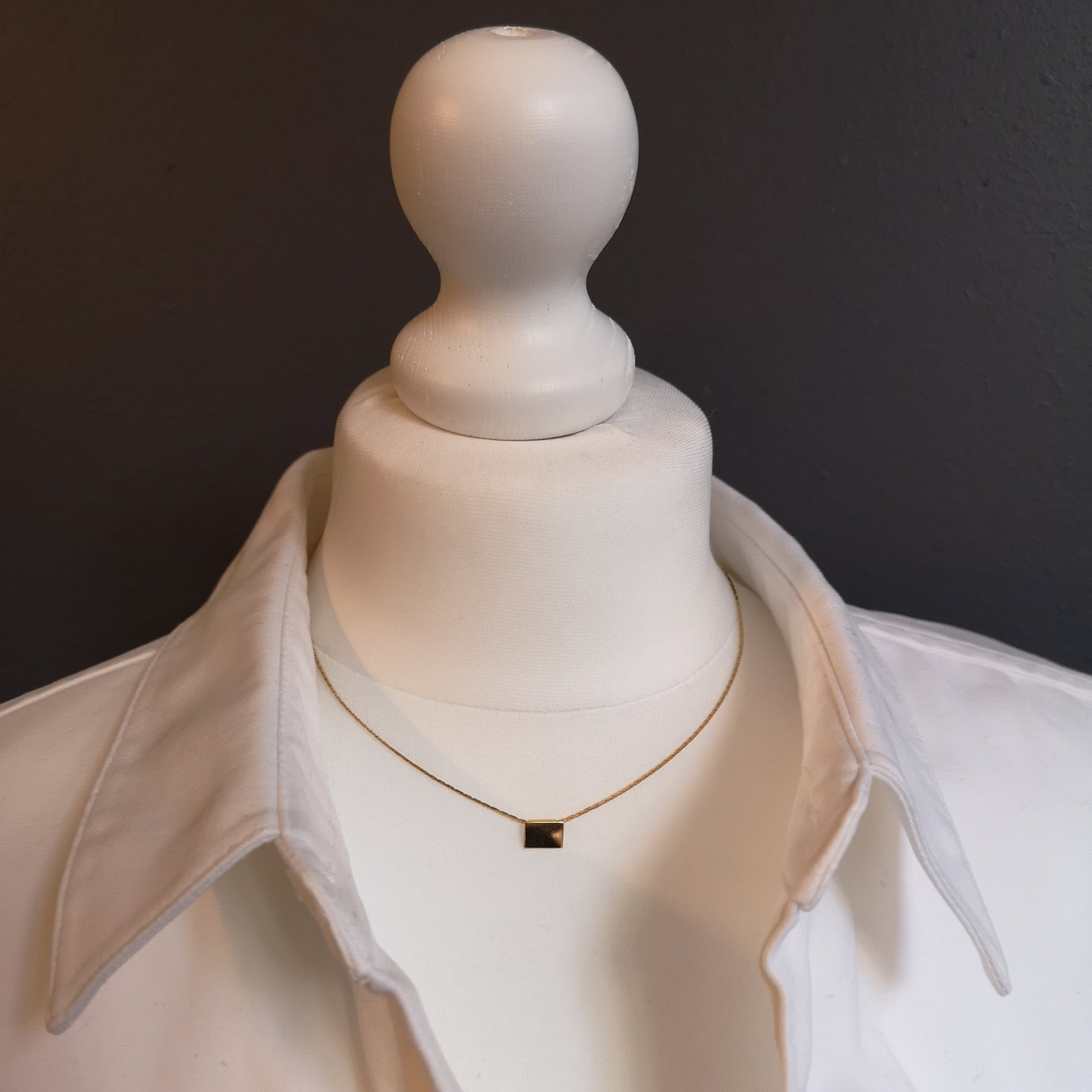 The classic from 1995 still in the collection, à thin weightless metal plate on a 1 mm thin, but solid chain of 39 cm. Non allergic brass plated with 24 carat gold or rhodium. Jewellery box included.