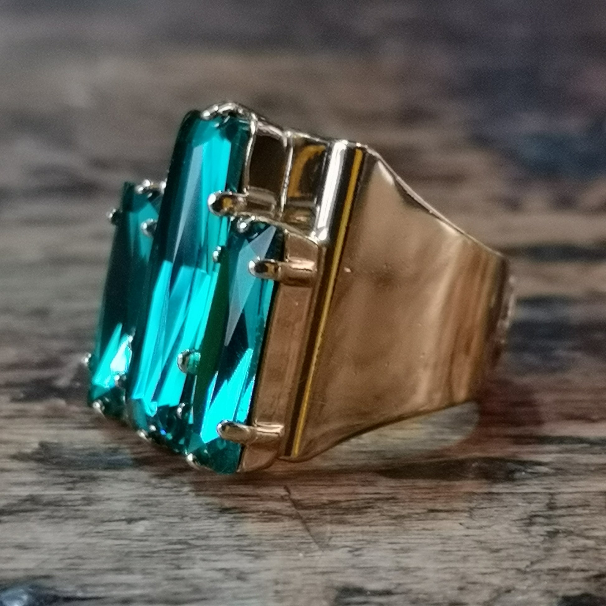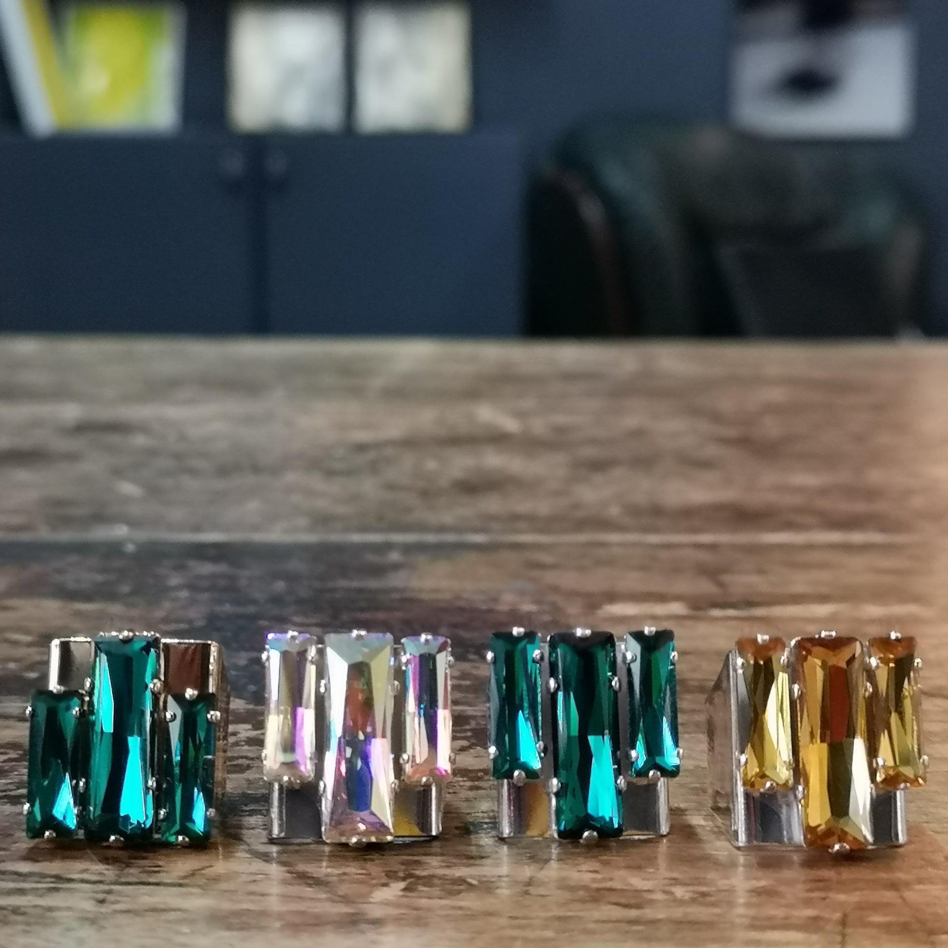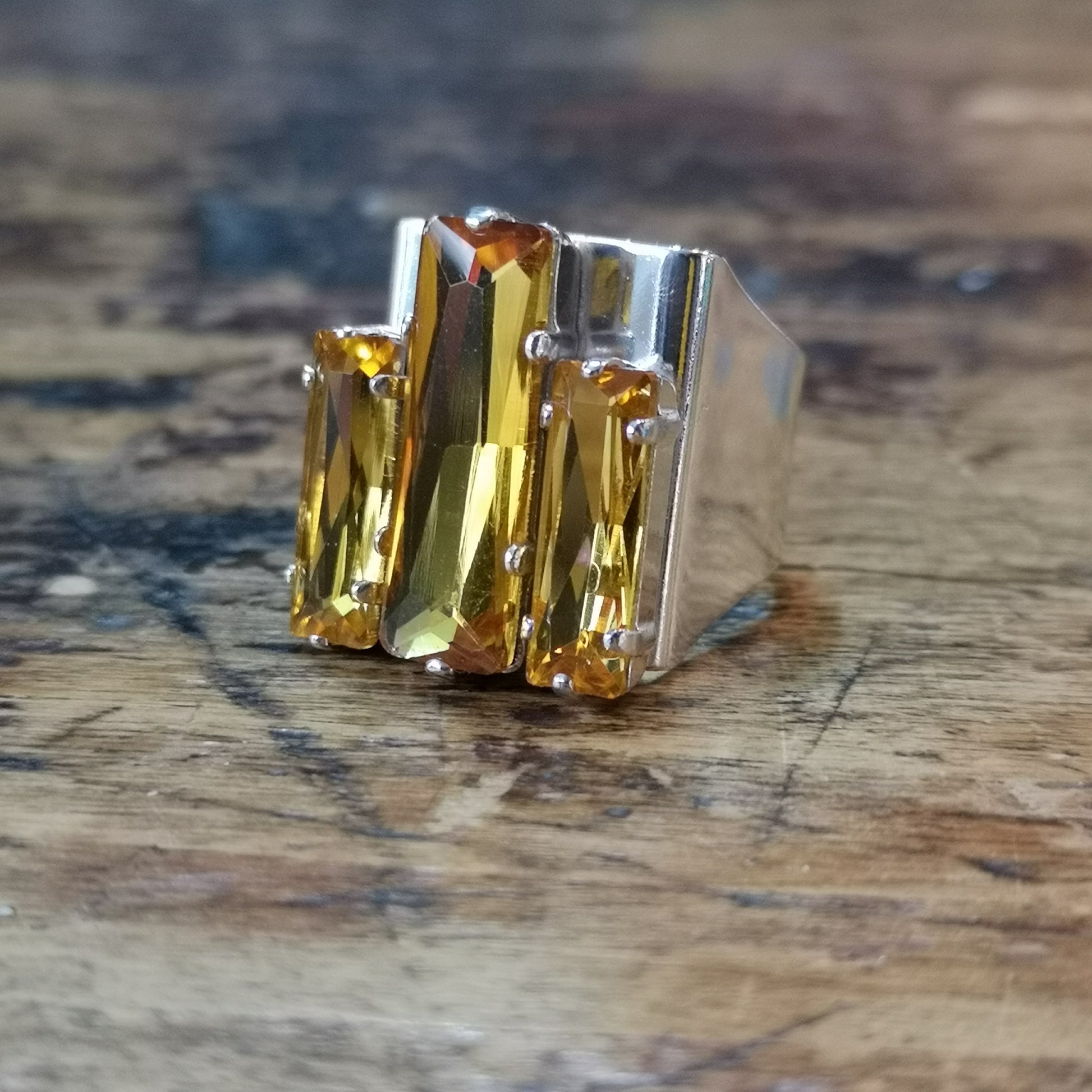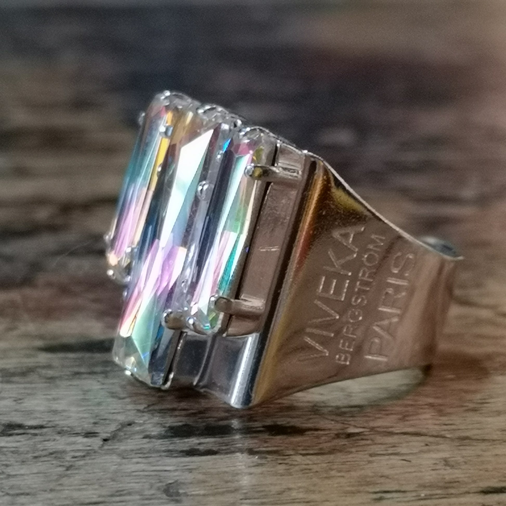 3 colored crystals size 7*21 mm on a mediumsized, but very well adjustable ring (from S to M to L to XL). Gold- or rhodiumplated brass. Hypoallergenic. Jewellery box included.