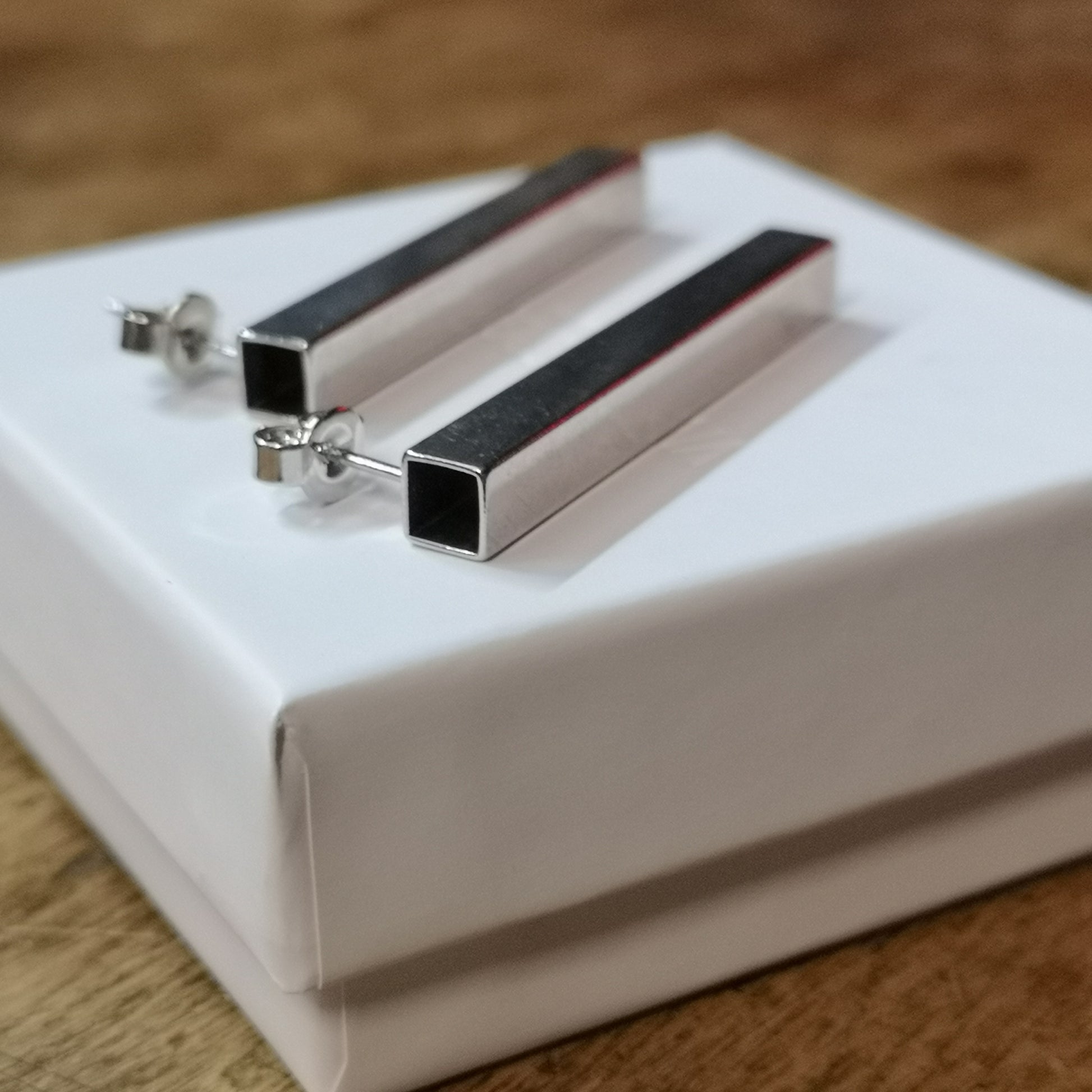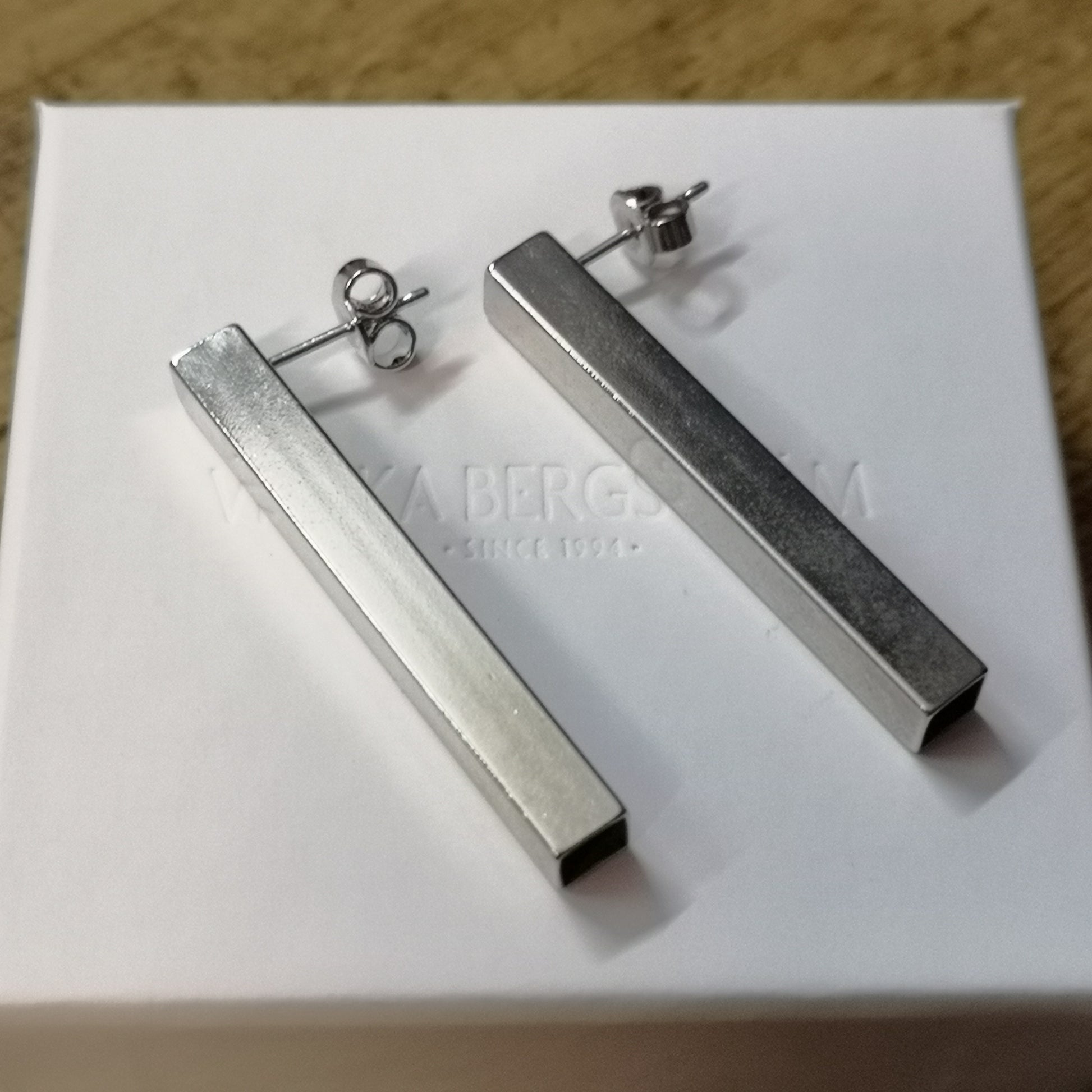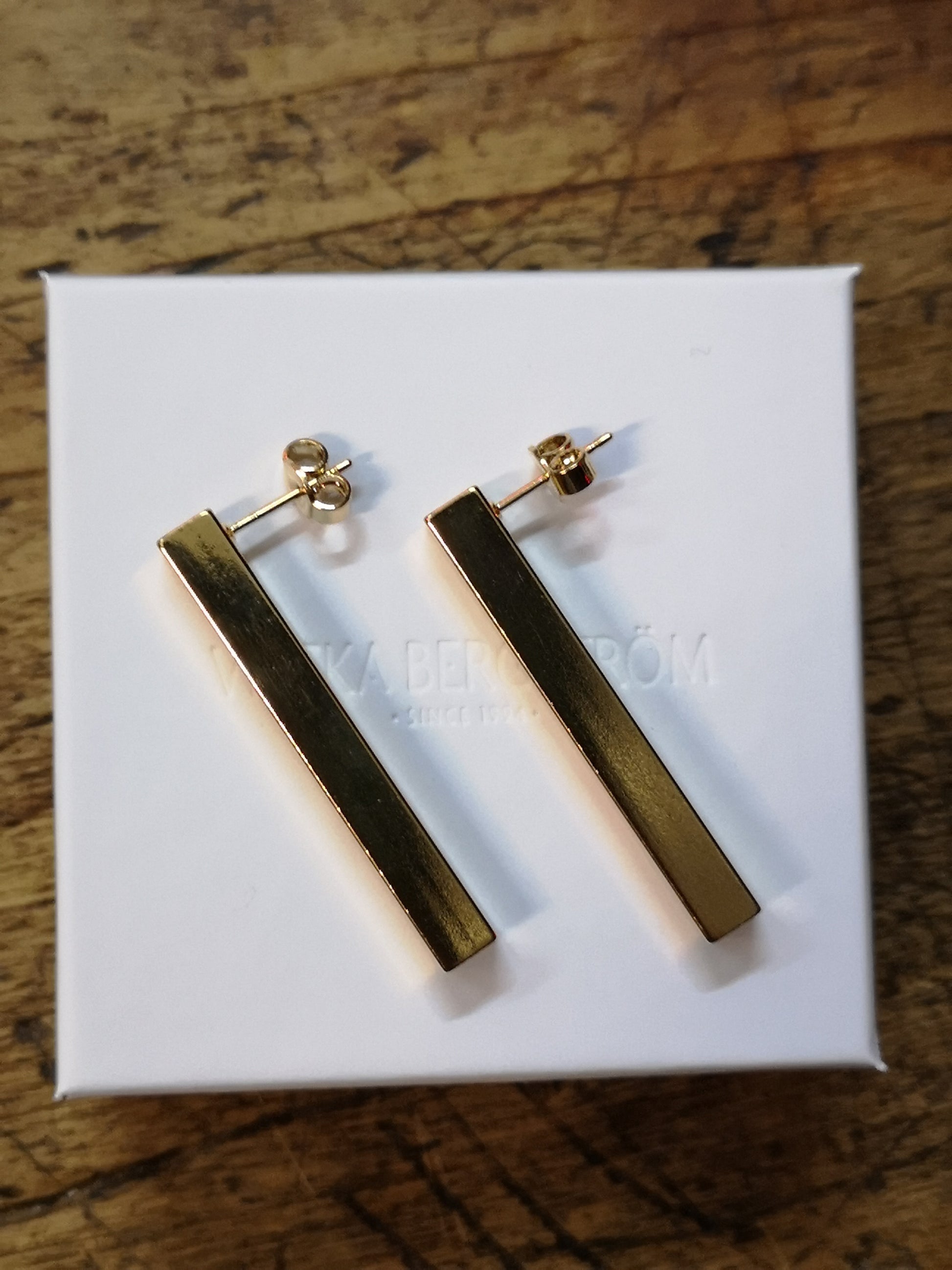 one of the oldies from 1995, a 40*5 mm tube for pierced ears with attachement in the end, so it hangs down. Non allergic brass plated with 24 carat gold or rhodium. Jewellery box included.