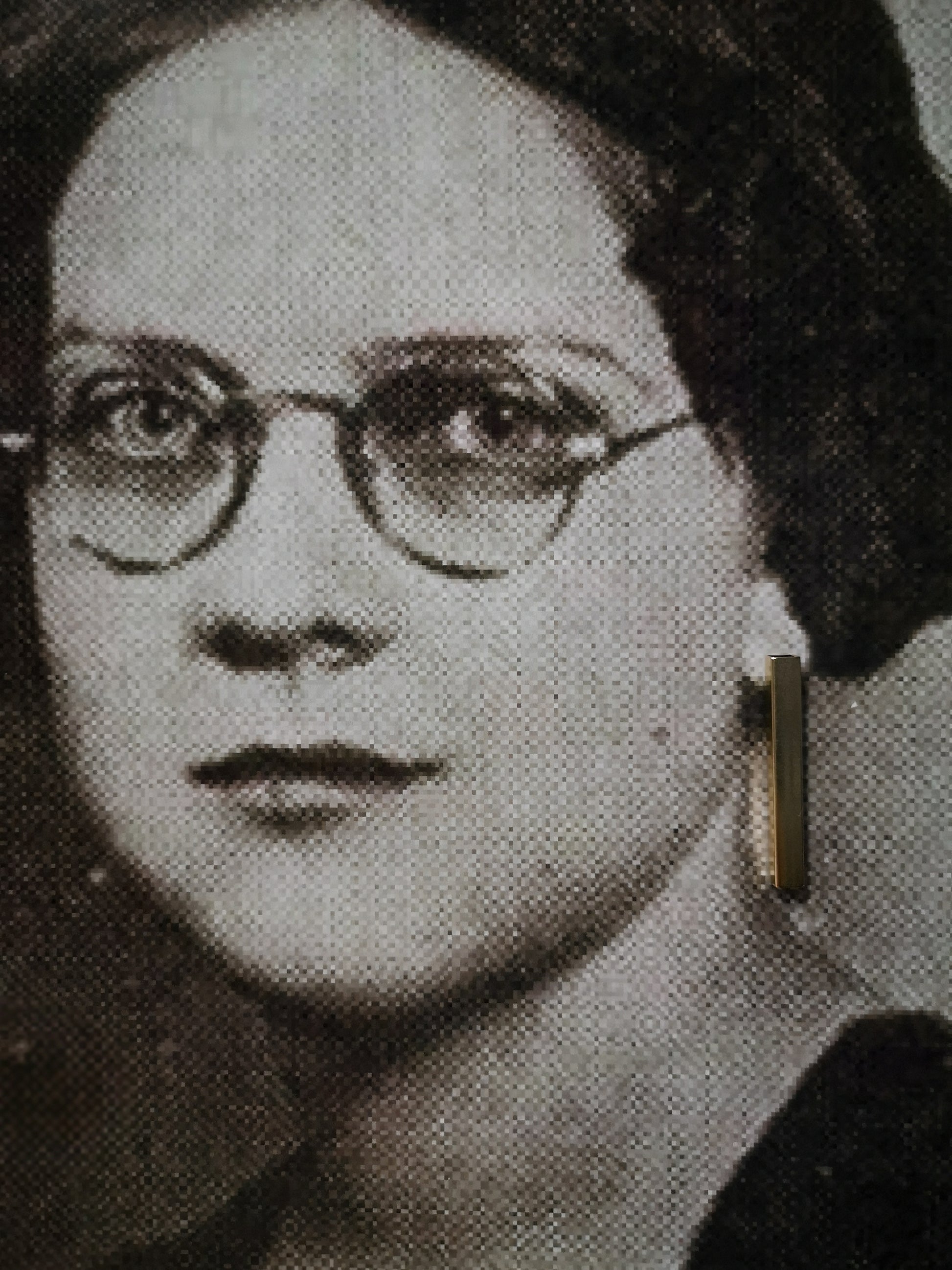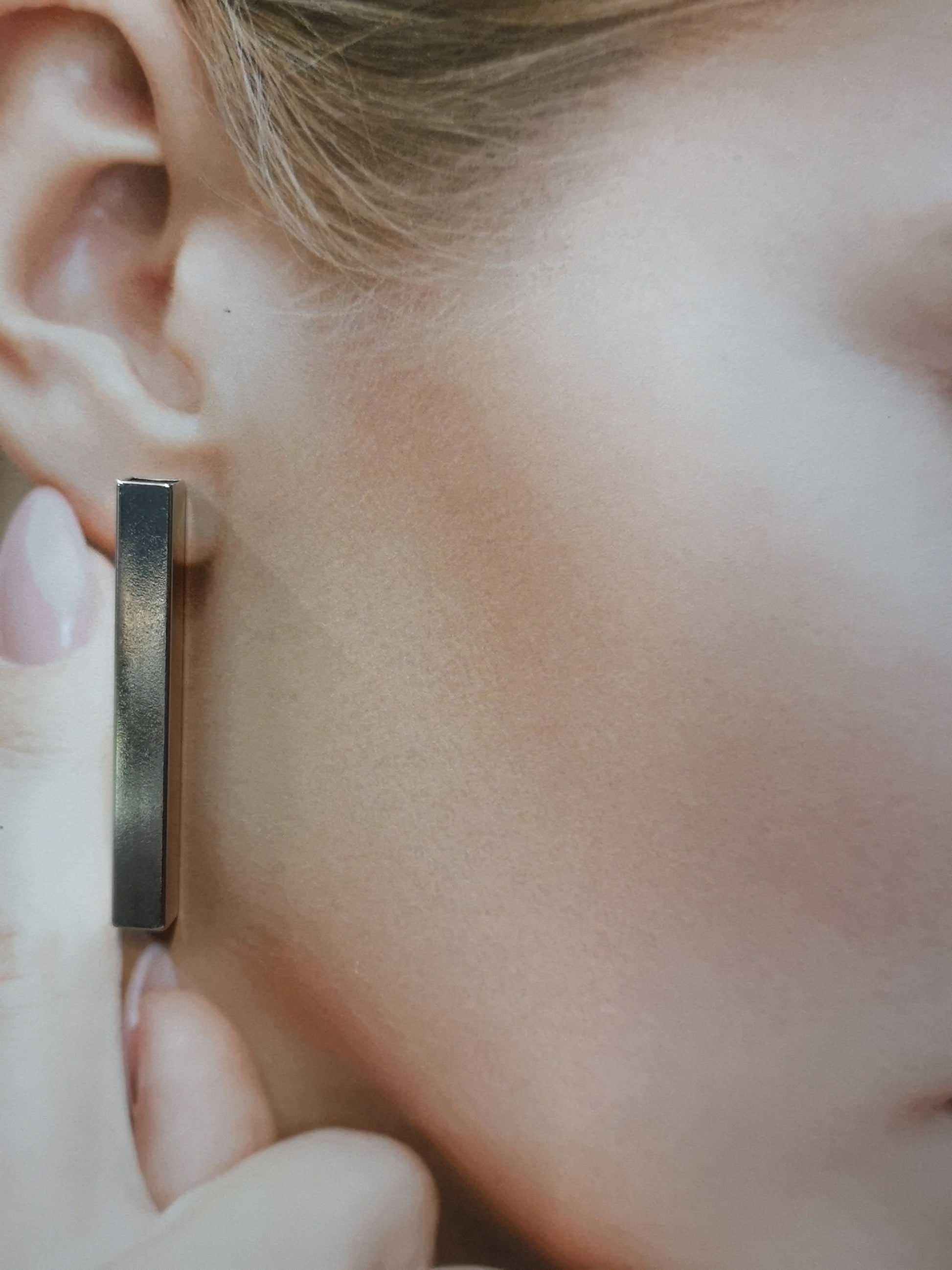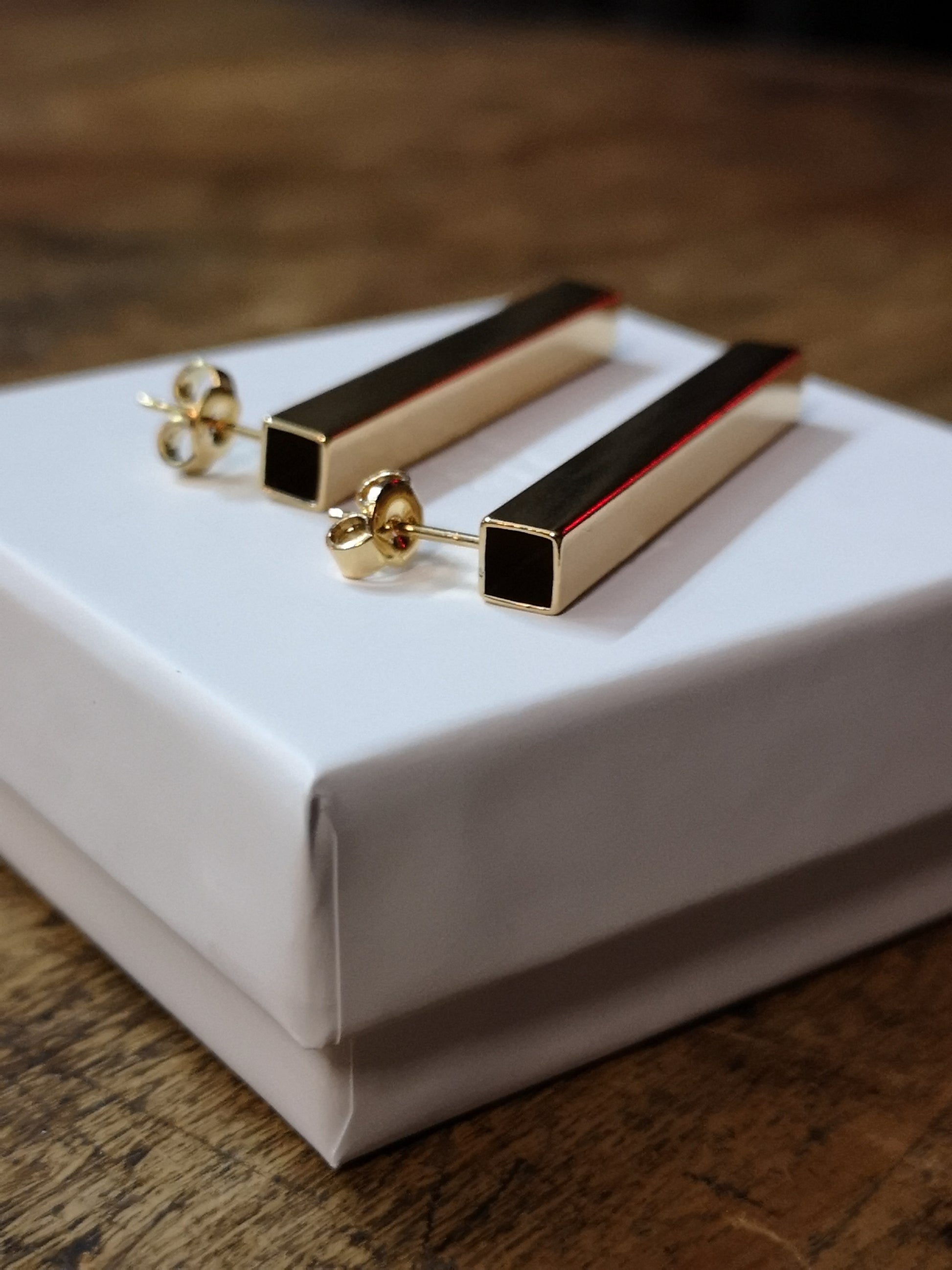 one of the oldies from 1995, a 40*5 mm tube for pierced ears with attachement in the end, so it hangs down. Non allergic brass plated with 24 carat gold or rhodium. Jewellery box included.